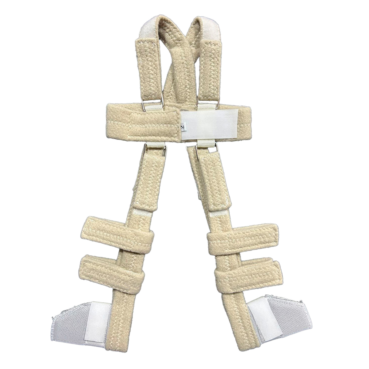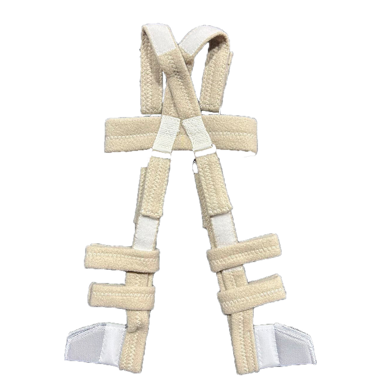 Férula recomendada para tratamientos de displasia, luxaciones o subluxaciones congénitas de cadera. Confeccionado en tirantes de algodón acolchados en su interior. Sistema de regulación de hombros, cintura y miembros inferiores por medio de velcros. De fácil colocación, permite higienizar al niño sin quitar el arnés.
