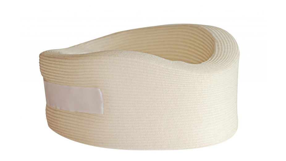 Inmovilizador cervical de una sola pieza confeccionado en espuma de poliuretano de 43 kg de densidad forrado en malla tubular de algodón cierre posterior de velcro.