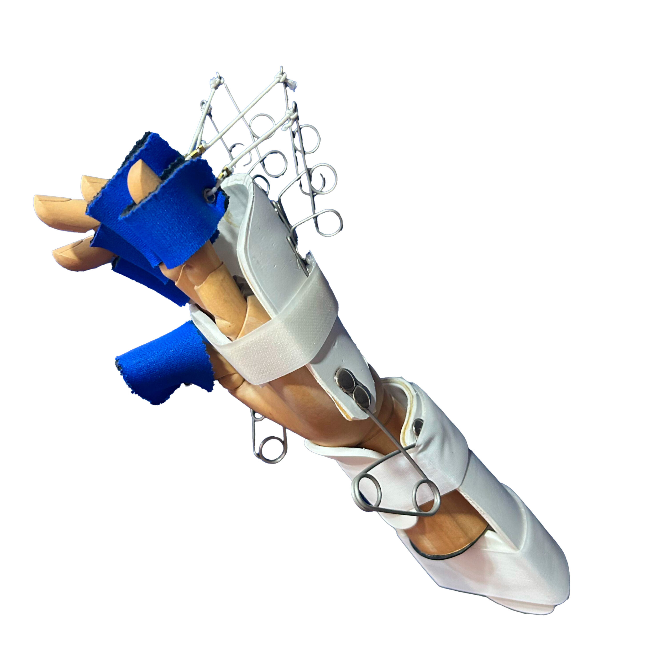 Férula activa para extensión de dedos articulada, con resorte flexible en muñeca que permite regular la flexo-extensión. Ajuste palmar de velcro.