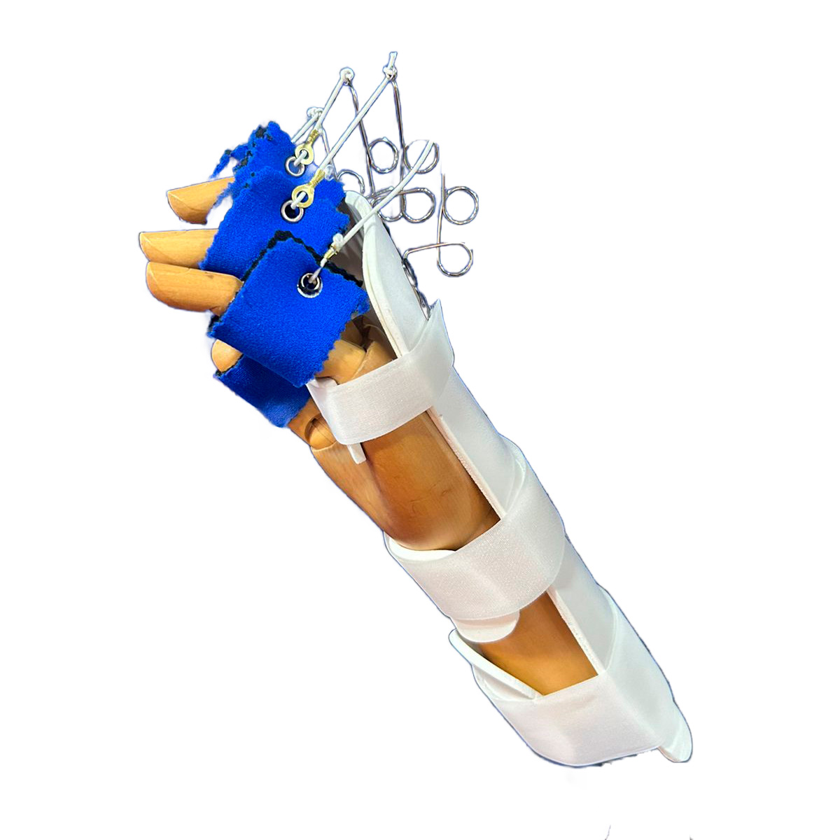 Compuesta de una valva dorsal termoformada en antebrazo y mano resortes individuales en acero flexible y elásticos unidos al resorte para asistir a la extensión de una, varias o todas las falanges, ajuste palmar de velcro.