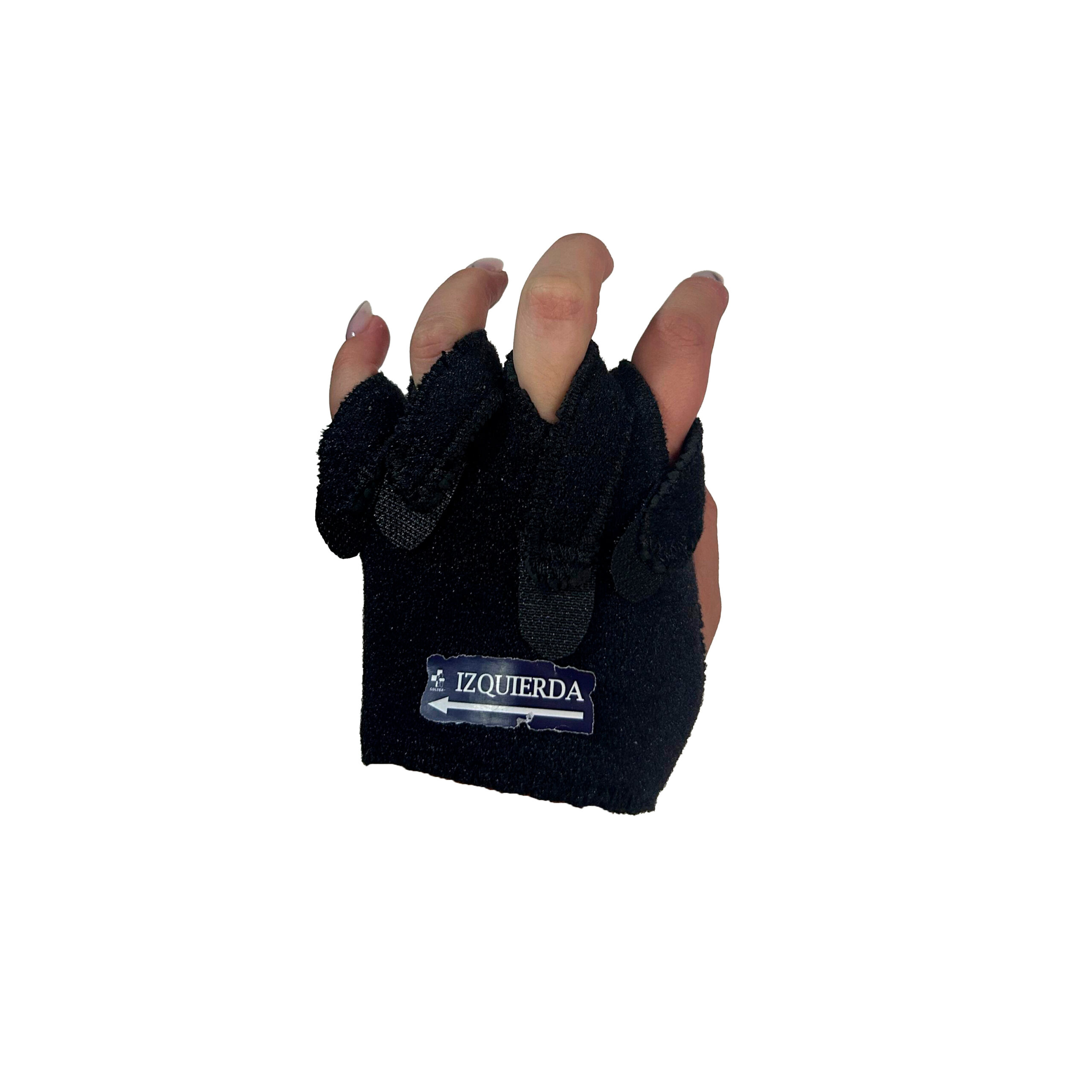 Guante de neoprene afelpado con orificio para el pulgar que alinea y sostiene las articulaciones metacarpo-falángicas de la mano mejorando la posición de los dedos.