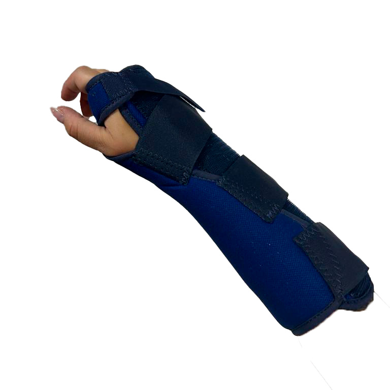 Férula semi rígida larga que controla la flexo-extensión de muñeca, dejando libre los dedos y el pulgar. Confeccionada en tela pique bondeada en espuma de poliuretano de 8mm de espesor, ballenas dorsal y palmar en aluminio de 2mm de espesor, 3 cierres de velcro.