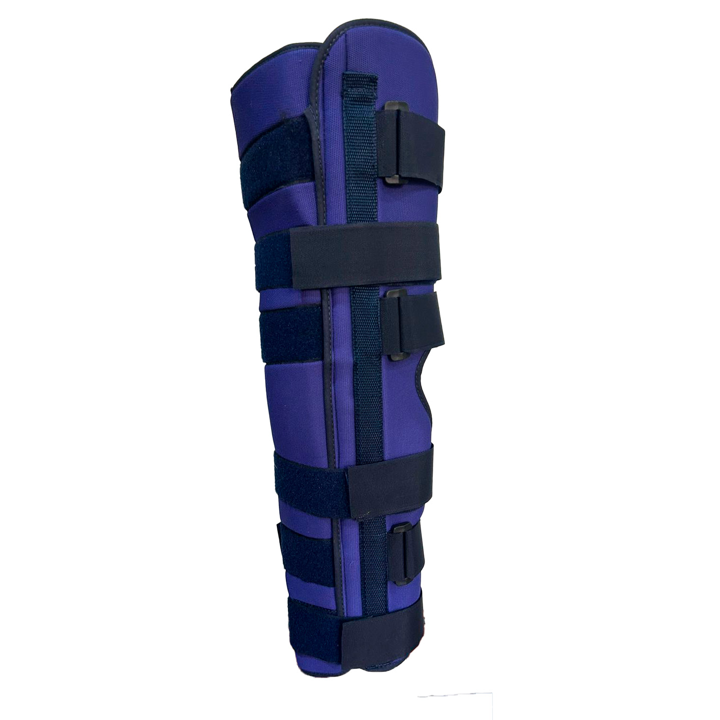Férula inguino-maleolar que controla la flexo–extensión de rodilla. Confeccionada en 3 piezas de tela pique bondeada con espuma de poliuretano de 8mm de espesor, que permite regular la circunferencia de la férula, con cuatro ballenas de aluminio: 2 posteriores y 2 laterales ajustable por medio de 6 tiras de velcro.