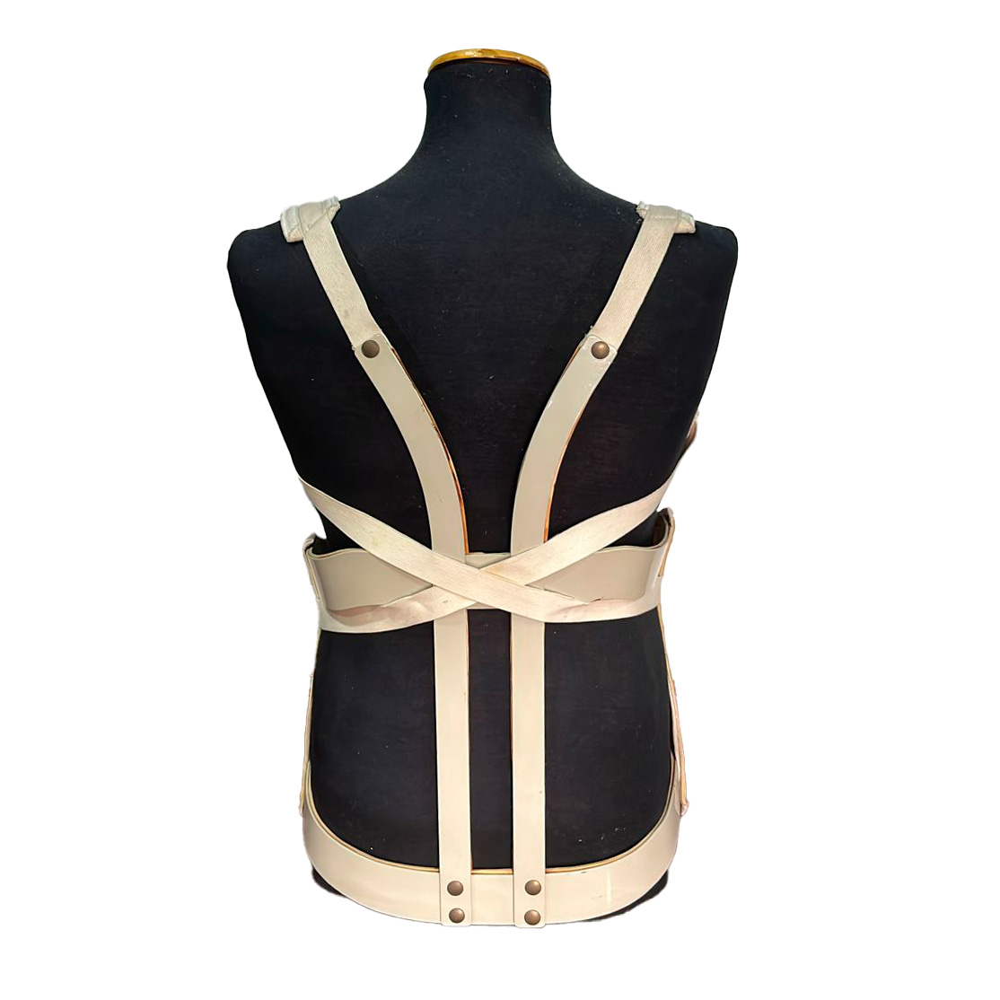 Kit preformado para el armado del corse compuesto de 1 barra horizontal superior, 1 horizontal inferior y 4 verticales, 2 posteriores curvas de 50cm de altura y 2 laterales. Todas en aluminio de 2mm de espesor, pintadas con epoxi elástico, que permiten doblar las mismas sin dañar su cobertura. El kit incluye acolchados de todas las barras en goma color piel de 3mm, y remaches. No incluye la faja de tela anterior.