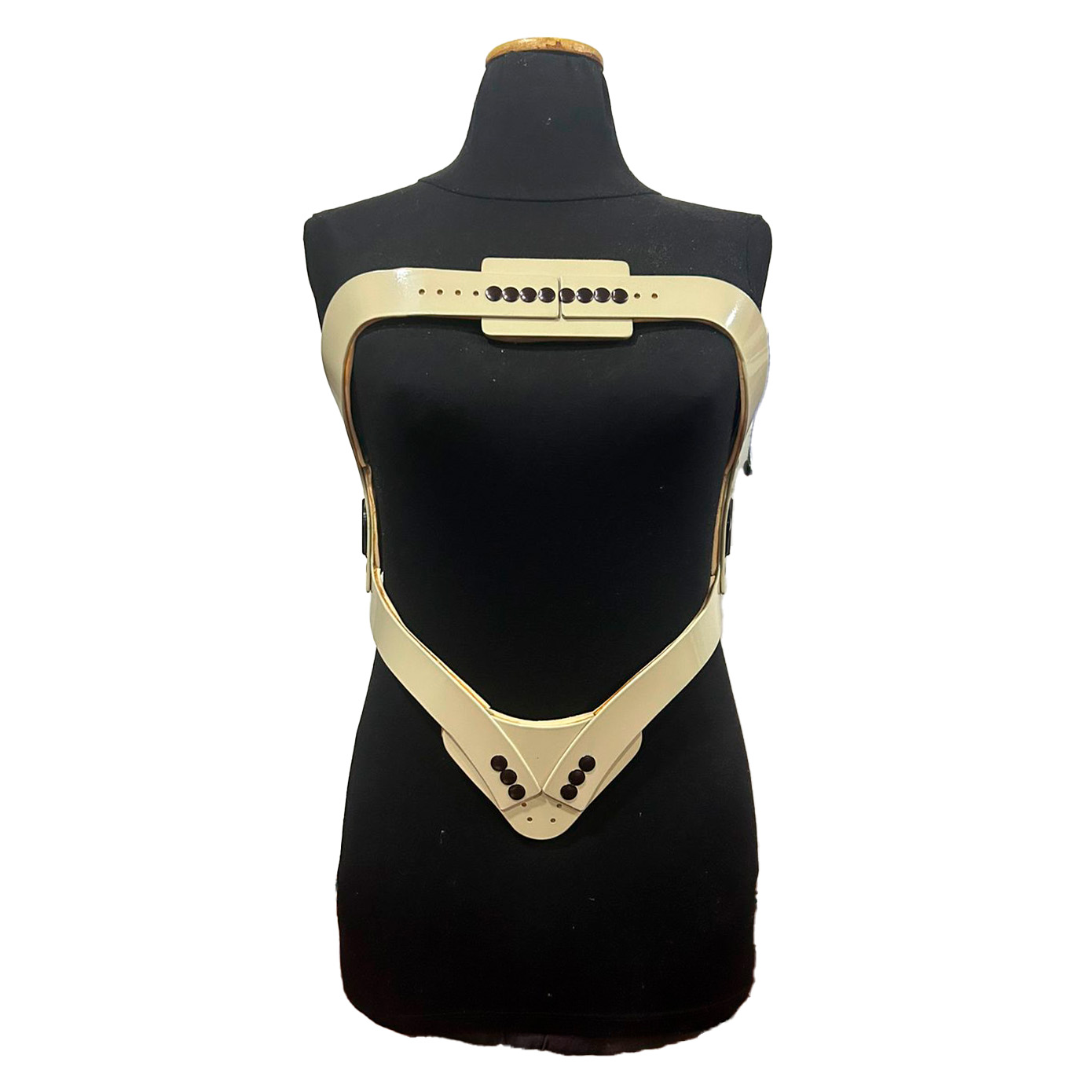 Kit compuesto por 2 barras superiores para tórax, 2 inferiores para pubis y 3 placas, 1 para esternón, pubis y 1 lumbar. Todo el Kit pintado con epoxi elástica, que permite doblar las mismas sin dañar su cobertura. el mismo incluye acolchados de 8mm de espesor para las placas y de 3mm para las barras, mas remaches, tira de velcro y pasantes.