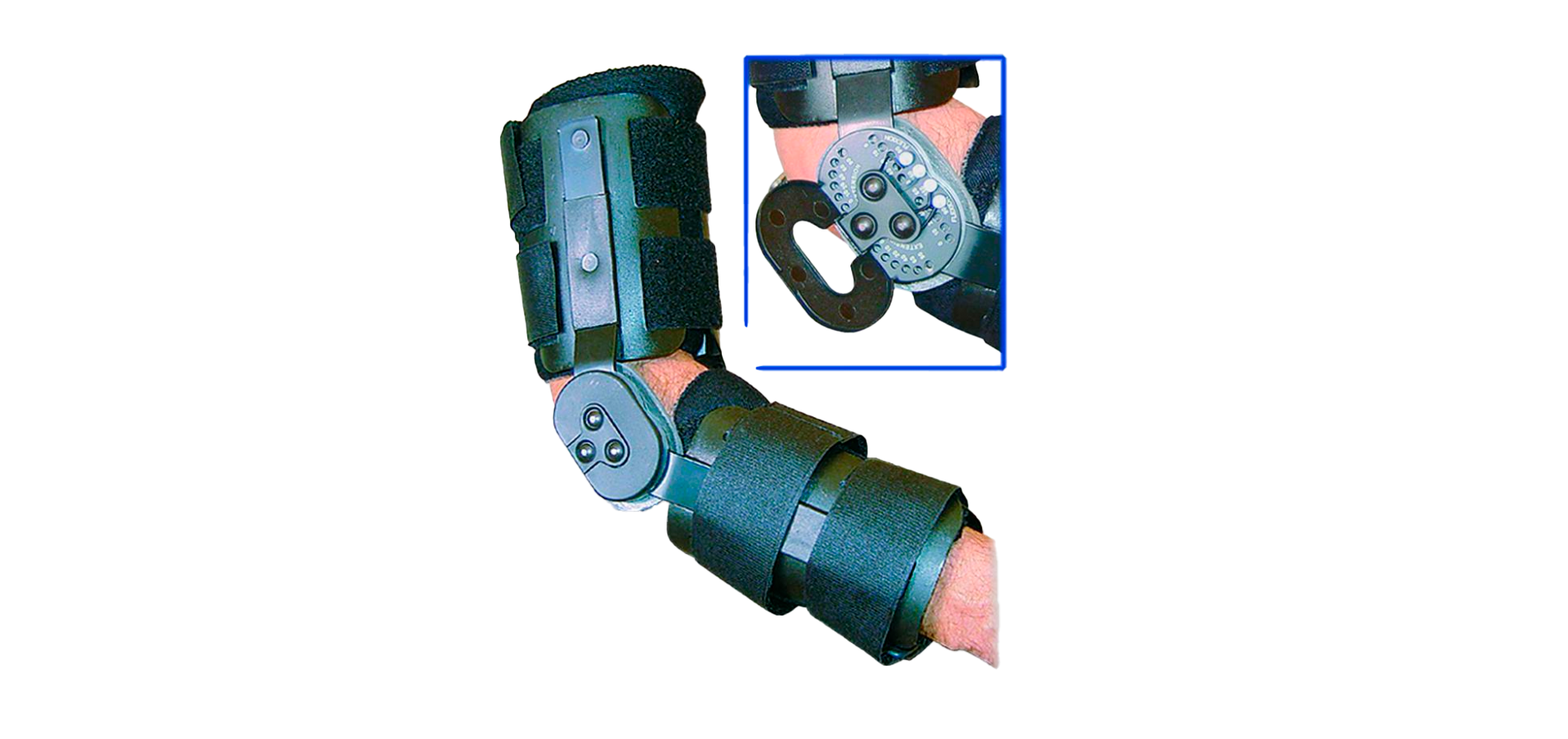 Férula para inmovilizar total o parcialmente la articulación del codo por medio de una articulación policéntrica regulable en flexoextension cada 10º. Recomendada en Pre o Post operatorios de dicha articulación. Compuesta de 2 barras laterales en aluminio articuladas, acolchados interiores desmontables en tela velour bondeada en espuma de poliuretano de 8mm de espesor, refuerzos laterales de polietileno fijos a las articulaciones. Cierre de velcro por medio de 4 tiras, 2 en brazo y 2 en antebrazo.