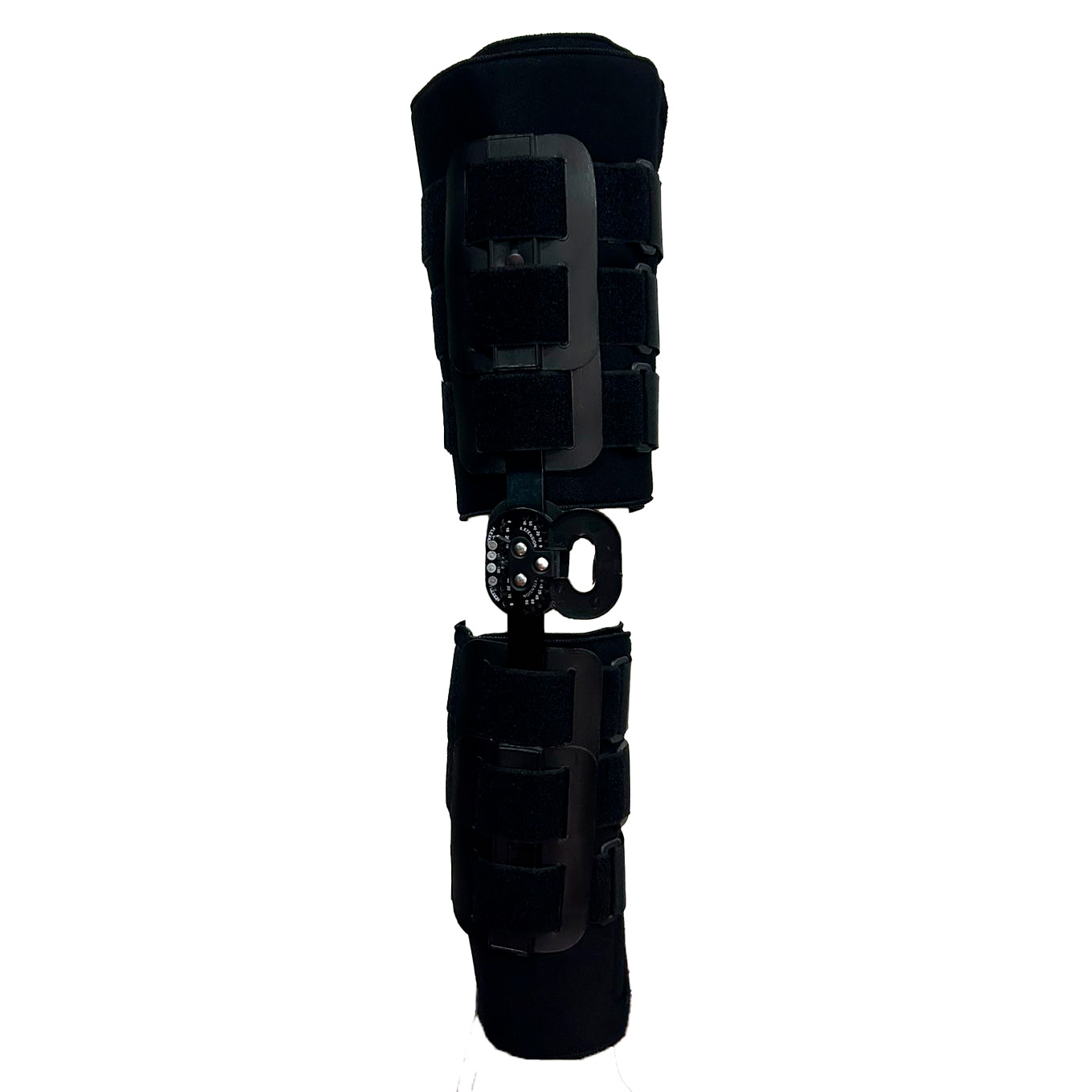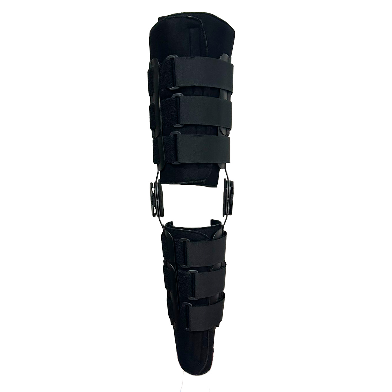 Férula que controla el movimiento medio lateral y la flexo-extensión de la rodilla. Compuesta de dos articulaciones policéntricas laterales de aluminio, regulables cada 10º en flexion o extensión. Acolchados interiores desmontables en tela velour bondeada en 8mm de espesor. Placas de polietileno en muslo y pantorrilla, ajuste por medio de 6 tiras de velcro regulables.